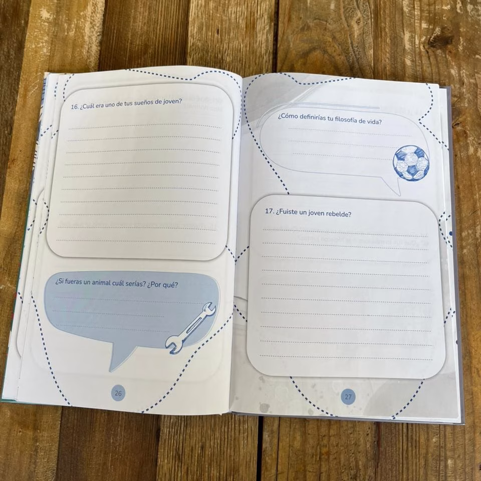 Con un formato sencillo y dinámico, este cuaderno guiará a tu papá a través de preguntas divertidas e inusuales que despertarán recuerdos únicos. Además, podrán personalizarlo con fotos y recuerdos especiales, creando así un tesoro inigualable.
